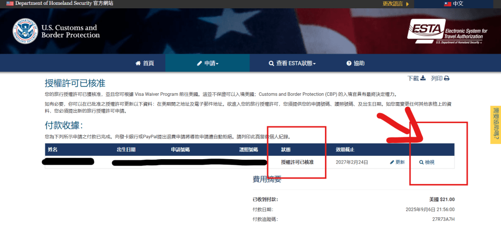 就會跳到這個頁面,狀態會顯示是否核准,核准後就可以從檢視那邊下載整份ESTA