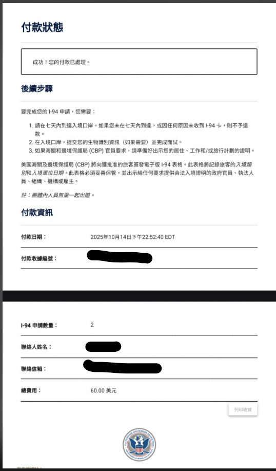 我在爬文的時候非常困惑,因為有人用I94、有人用I94W,AI的資料顯示前者是需要簽證才可以入境的旅客,後者是免簽持ESTA旅客申請,但官方網站只剩下I94可以申請,線上詢問網友,網友表示目前沒有I94W了,但我們搭火車入境比較符合 provisional I94,這個辦理後七天內要入境,所以即便知道114年9月30日從6美元漲到30美元,也無法提早申請,只能在加拿大旅遊時用手機線上辦理,這筆花得我們心如刀割。