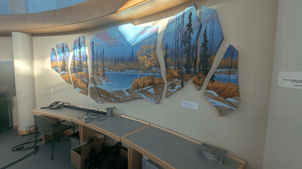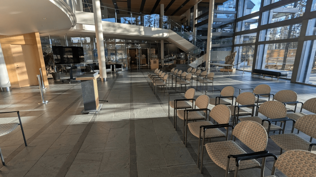 離開議場後,前往第二個有點隱密的房間,導覽員告知這是用來密室協商之用(?),牆上掛的圖畫作品都與黃刀鎮的文化特色有關。這個較小的圓形密室中間有個很酷的設備,上方是一個全反射裝置,站在正下方講話聲音就會被反射到房間中的所有地方,如同不插電的麥克風,超酷。