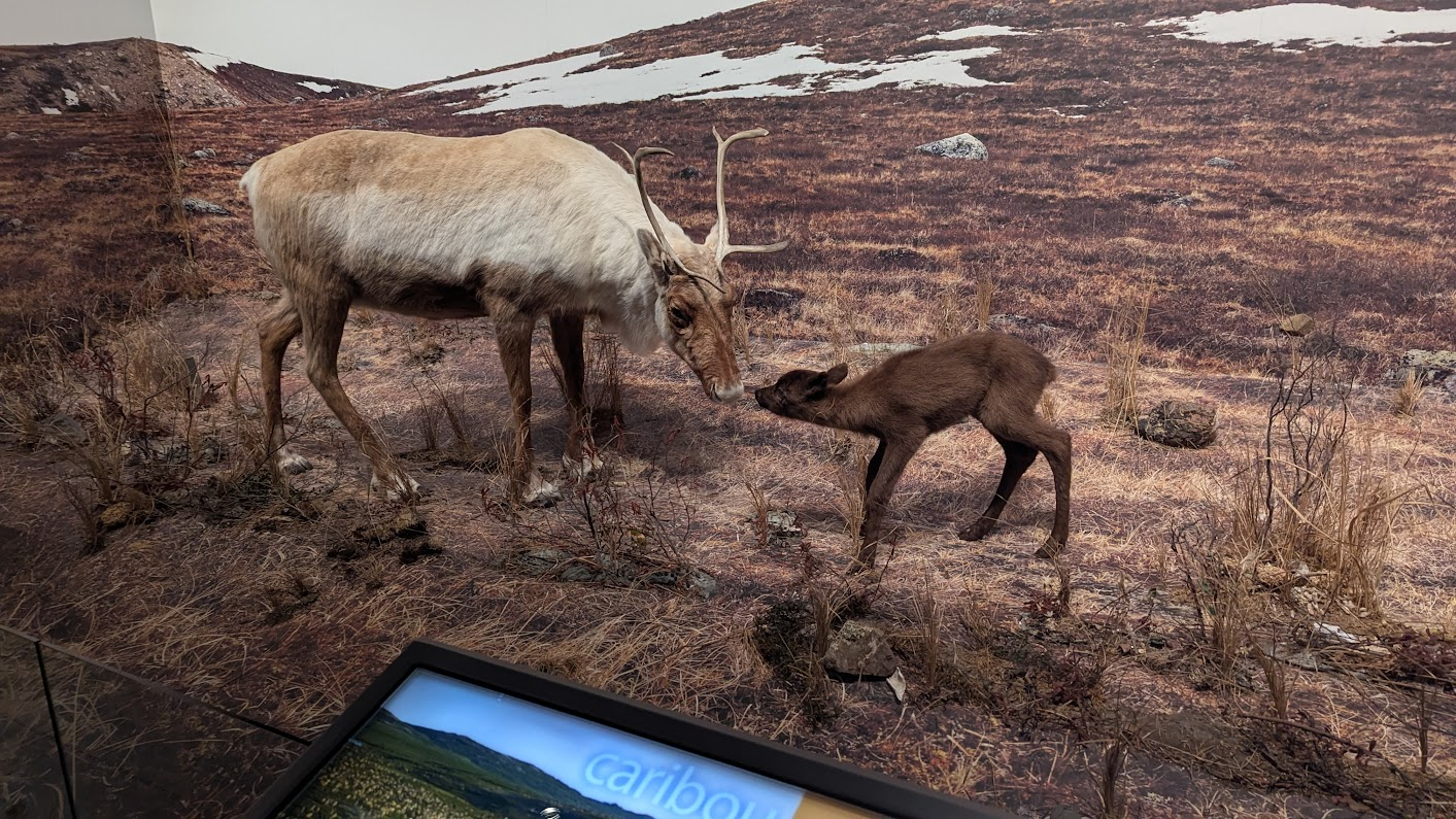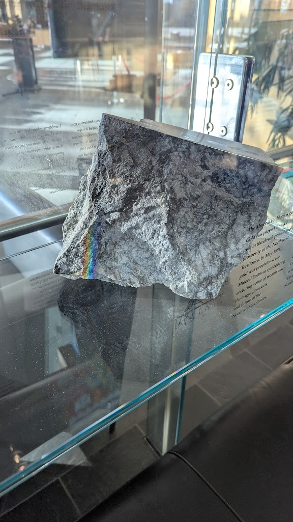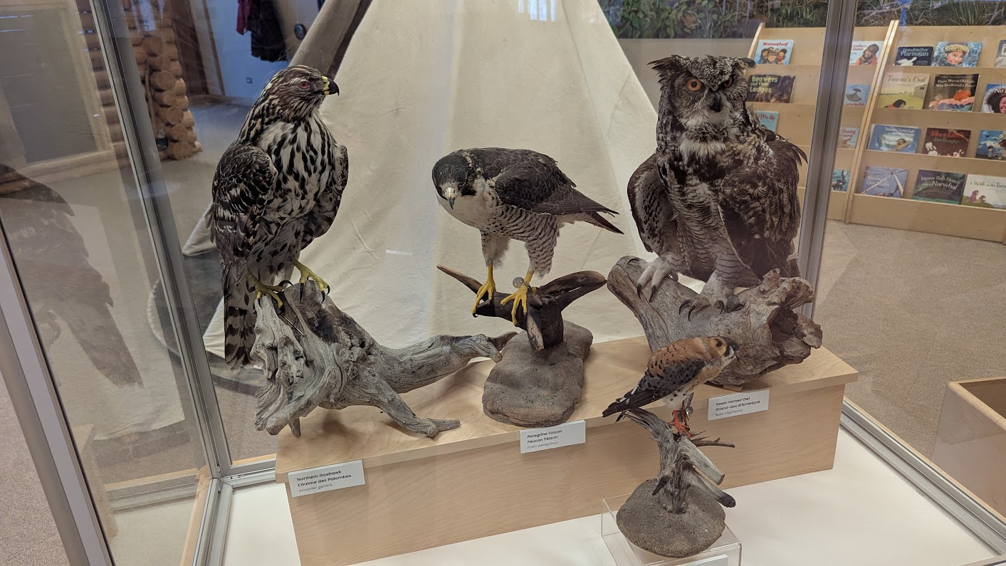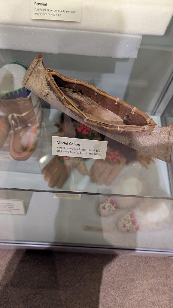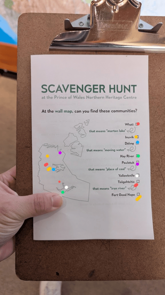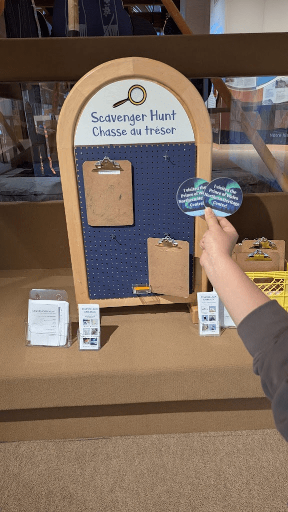 英文直翻為威爾斯親王北方文化遺產中心,因為名稱太長了所以當地人都叫它黃刀鎮博物館。博物館有區分成好幾個展區,除了原住民衣物、語言、生活器具、礦產開發等文化歷史內容,也有許多動物標本,可以看見祖先們對於大自然的敬仰珍惜以及惜物的智慧。進去後右側有一區放了許多文件夾和鉛筆,上面有一張scavenger hunt(尋寶遊戲問卷),可以依照上面的指示一區一區逛,題目都不難,除了可以增加逛展覽的趣味性外,完成後也會得到博物館限定之貼紙。
