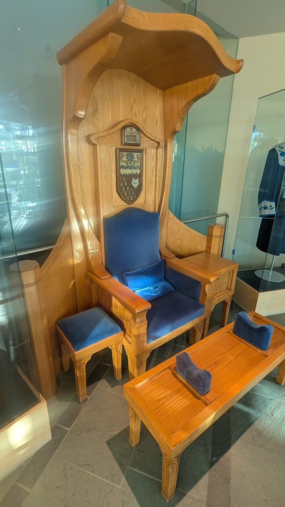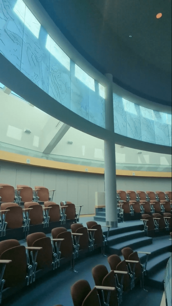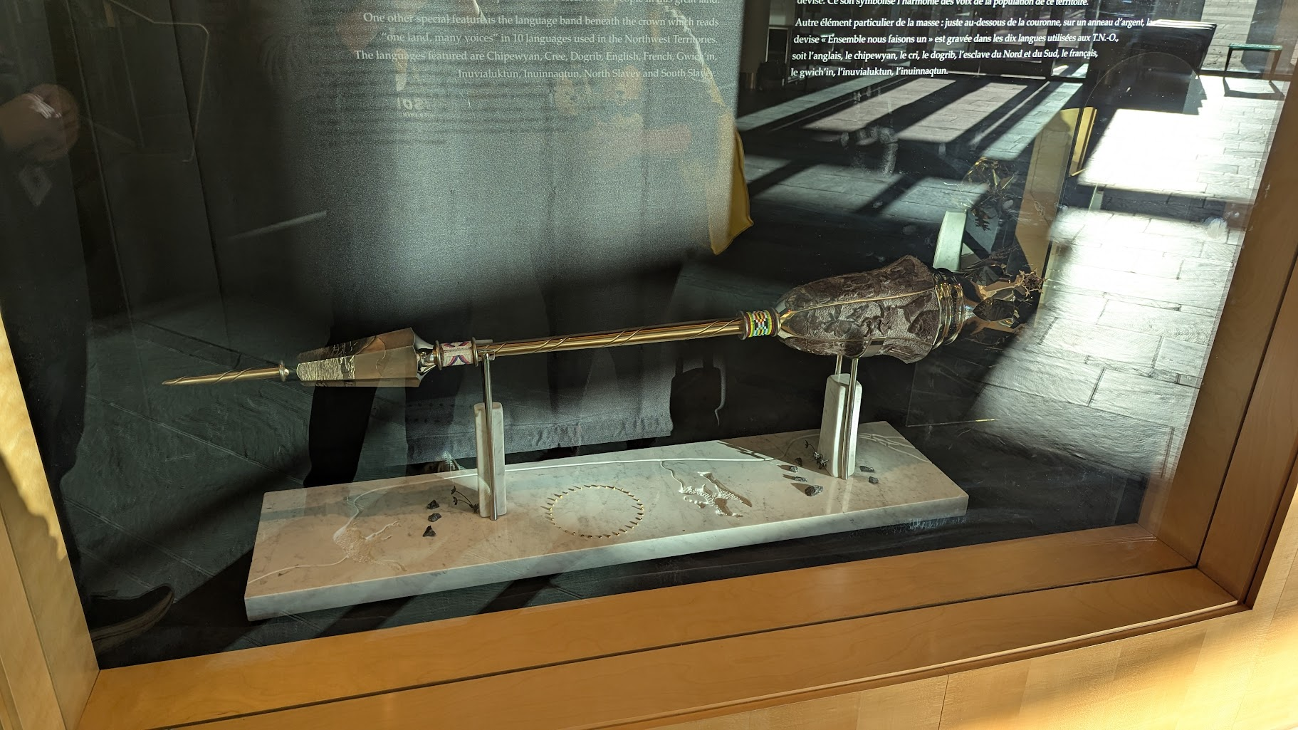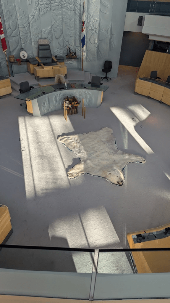 參觀完權杖跟各種文物,接著導覽員帶我們從二樓進到議會的會議室現場(簡稱議場),站在這邊往下望,一樓議長們的座位區一覽無遺,連地板上躺著一隻北極熊做成的地毯,都看得清清楚楚;這樣的設計據說是要強調議會非常公開透明,讓市民也能夠參與整個過程,事實上議會期間如果有開會,也會開放民眾進入旁聽,屆時便能看到11個部落的酋長用各自的語言發表意見,再由口譯人員及時翻譯溝通。各委員的座椅後方還會有個小小的空間,口譯官跟助理就會坐在後方提供翻譯與補充資料給委員。