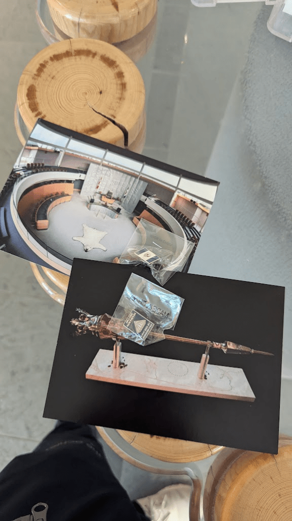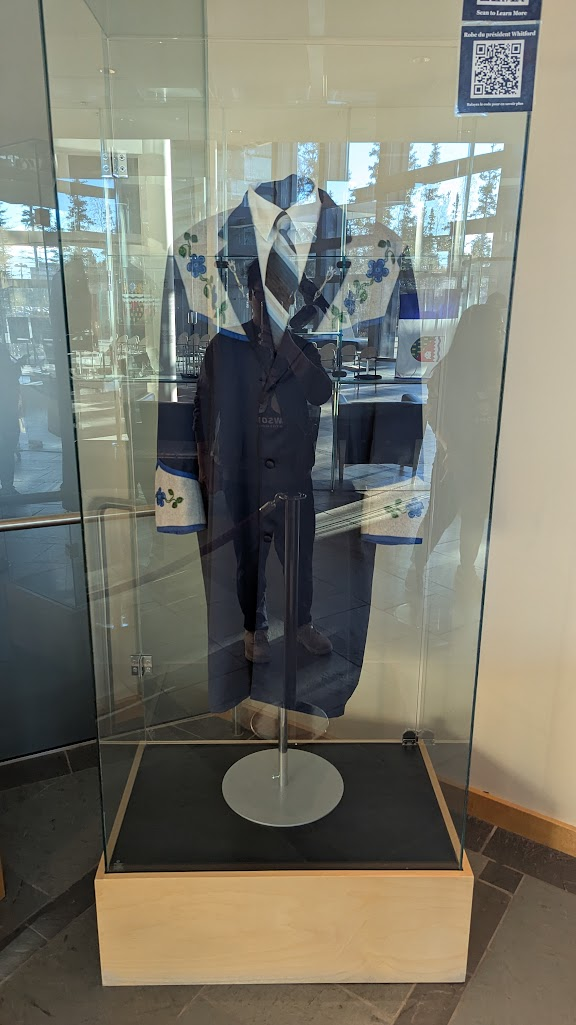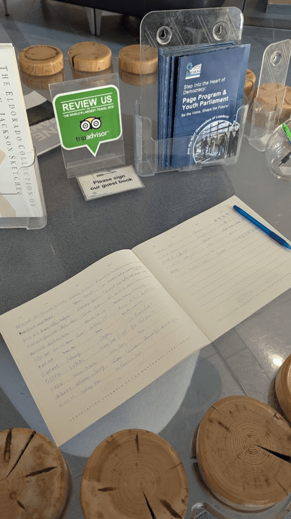 結束導覽後,竟然還可以到櫃檯去兌換明信片及別針各一,印象每個都有五六種可以選。非雪季的黃刀鎮有點無聊,所以推薦一定要安排到西北領地議會,是個非常值得來參觀、測試英文聽力和領紀念品的地方。