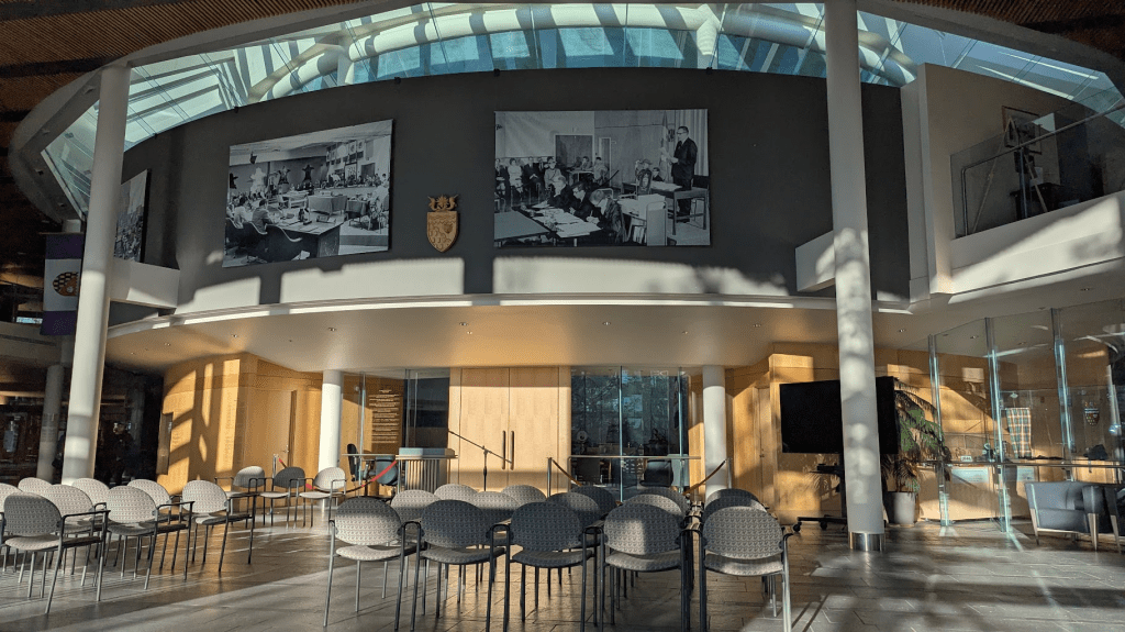前方可見的玻璃窗就是議會內部,都是公開透明的