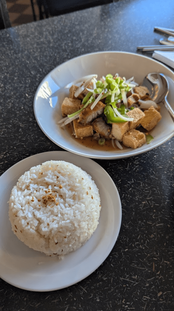 身為去菲律賓住過的人,菲律賓菜就是要吃lechon(乳豬)、sisig(鐵板炒碎肉)、galic rice(蒜頭飯),但因為我們四點就要去吃炸魚,菜單上亦無特別標示低消,最後只點一碗蒜頭飯一個Tokwat baboy(涼拌炸豬肉+豆腐),含小費約25.55加幣(約台幣568元)。分量與前幾次外食相比較為合理,點這麼少其實也有點不好意思,蒜頭飯真該被菲律賓列為國寶級菜餚,看似無味單吃卻非常有味道;Tokwat baboy的炸豬肉外皮脆口肉質多汁軟嫩,豆腐皮酥又不乾硬,搭配酸甜的醬汁與蔬菜十分開胃。這間口味非常合我胃口,若有機會再來黃刀鎮,會想要再訪把其他菜色吃一遍。