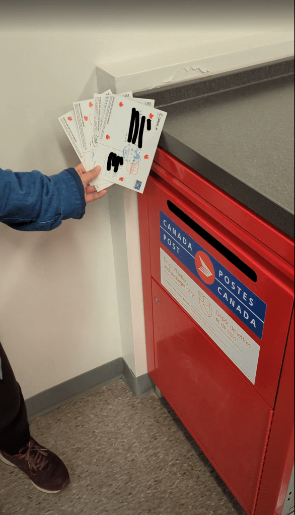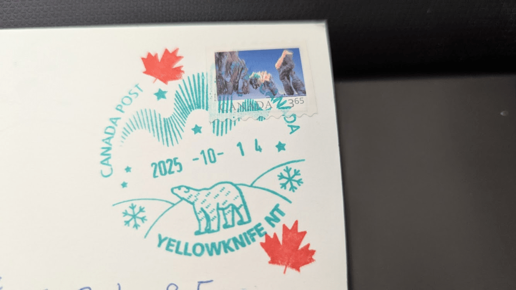 和郵局員工詢問的過程中都非常友善,他還提醒我部分超市裡面也有郵局服務,可以找就近的去寄送,員工還在我們面前蓋上黃刀鎮限定的北極熊圓戳章,真的非常可愛!