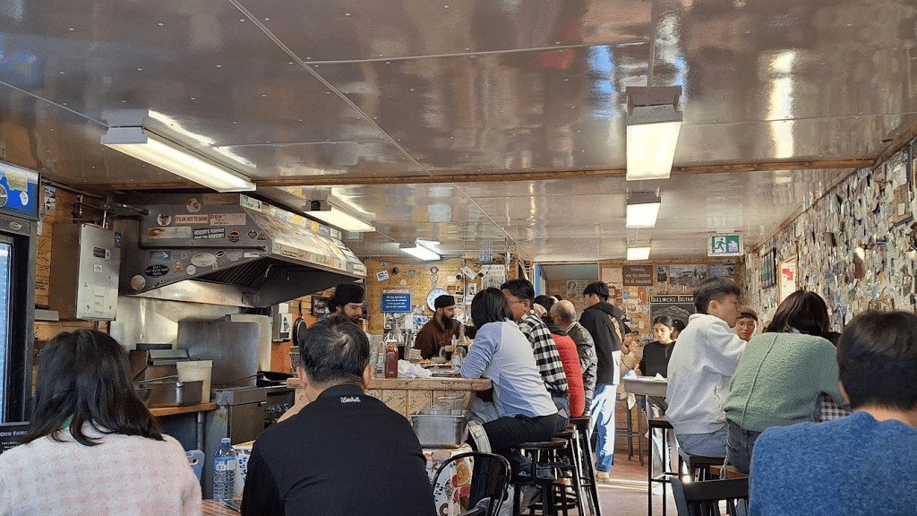餐廳牆壁上貼了許多名片、鈔票以及來自世界各地的簽名,我們座位旁也掛了一大片加拿大國旗;現場工作人員大概只有四人,需要兼顧烹飪、帶位、結帳、清潔,場面可以說是非常混亂,也因位置本來就擁擠,會需要與他人併桌,戶外用餐空間則需要六人以上才可以指定使用;因為廚房是開放式空間,煎炸烹飪的油煙味四處飄散,沒有開窗又人多的情況下,空氣品質極差。