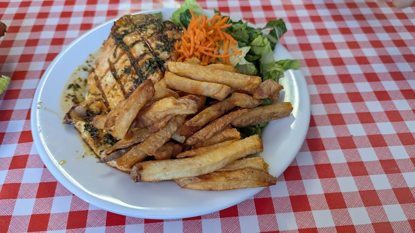 兩條魚都非常新鮮沒有臭味,煎鮭魚不會油膩,香料非常加分,有幾根刺,食用的時候需要特別注意;炸鱒魚麵皮薄脆,吃得出魚本身的鮮味,也因沒特別調味,味道較為清淡,可沾塔塔醬食用。可惜我們胃口真的太小,加上聞了太久油煙味感到噁心,後來打包回家再加熱就沒有這麼好吃了!