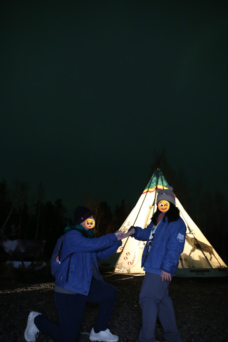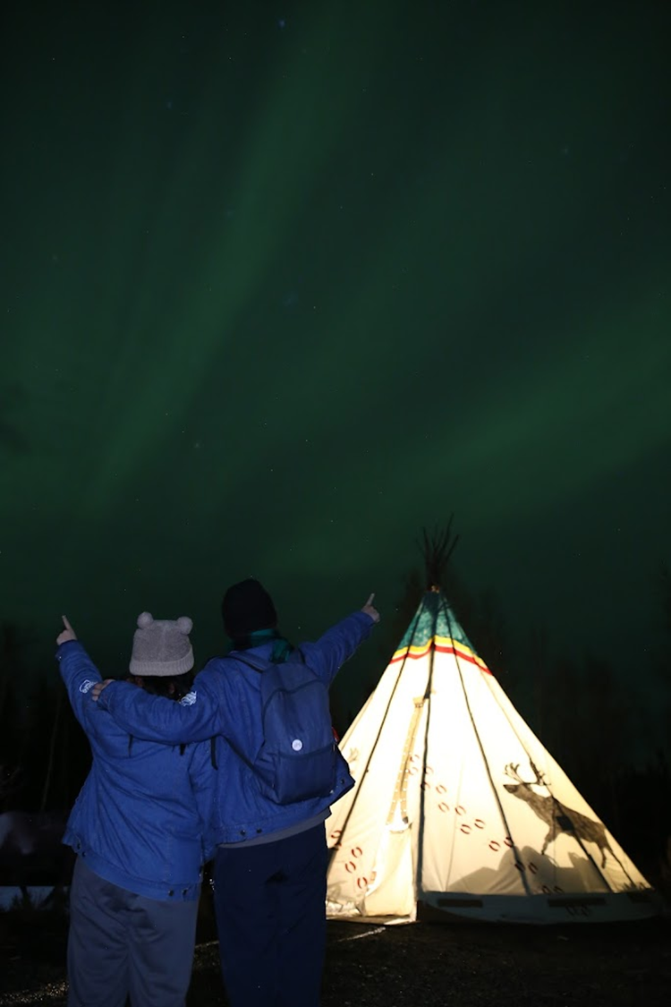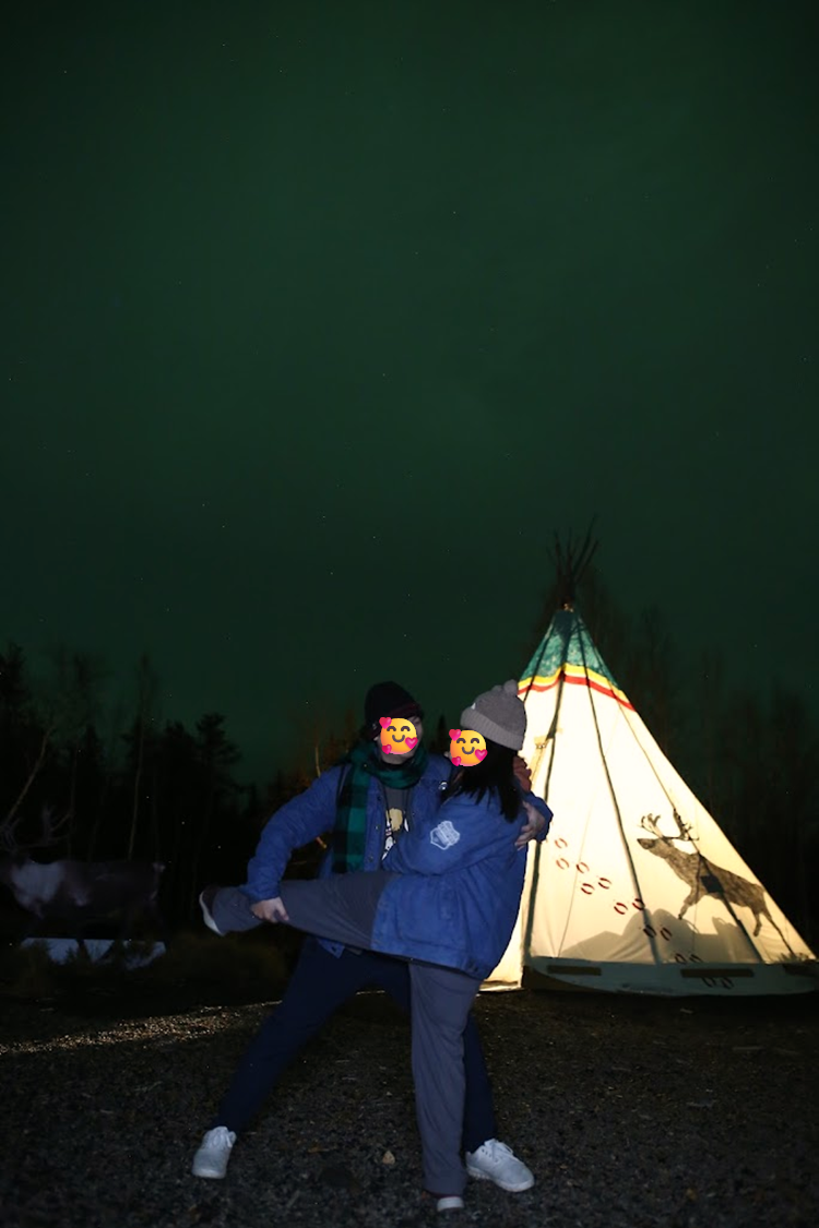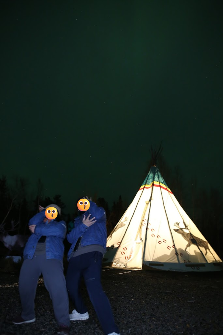 我必須大力推薦這位嚮導,她本身對攝影有興趣且是相關專業的,即便極光薄弱,仍想盡辦法要幫大家拍美照,還很會帶氣氛,為的就是希望大家不要帶著遺憾離開黃刀鎮;而且面對我們提出的疑問也都能盡量回答,還長的很面熟,讓人有親近感。後來才知道她早上有在珍珠奶茶店打工,我們喝的芋頭牛奶是她做出來的,難怪似曾相識,她還浮誇式跟我們敬禮說以後會好好攪散,超級好笑和可愛!