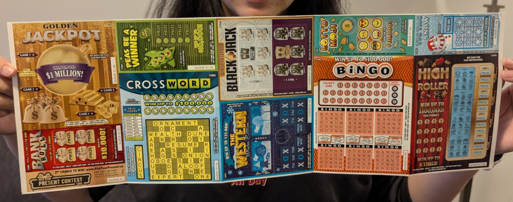 網路上查超市或樂透行都會賣刮刮樂,這次我是去Houcine’s Your Independent Groce,店員請我去1號櫃台挑選,玻璃桌會直接展示種類,直接跟店員說你要哪一種總共幾張,刮完如果有中獎,面對櫃台的最右手邊會有一個兌換樂透刮刮樂的地方,把刮刮樂拿到那邊就會換現金給你。20元只中4元,再怎麼心痛也比不過我在台灣買的大樂透和刮刮樂,那才是真的付諸流水,一毛都沒回來。