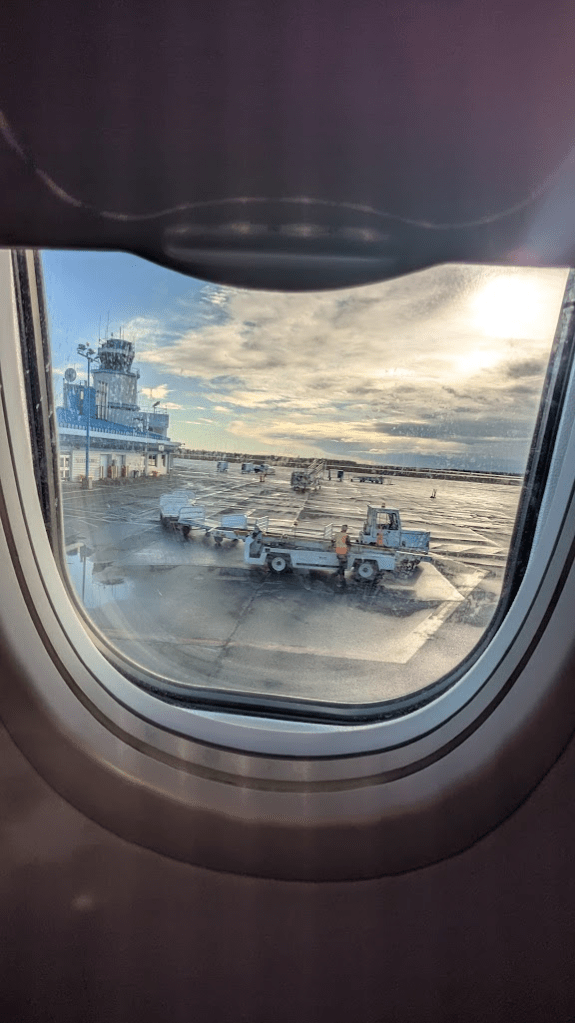 黃刀鎮機場非常小,我們一樣有事先線上報到,但還是要排隊秤重行李,結束後排隊過安檢,整個過程不到一小時,現場的座位有限,等了一陣子才有位置可以休息。