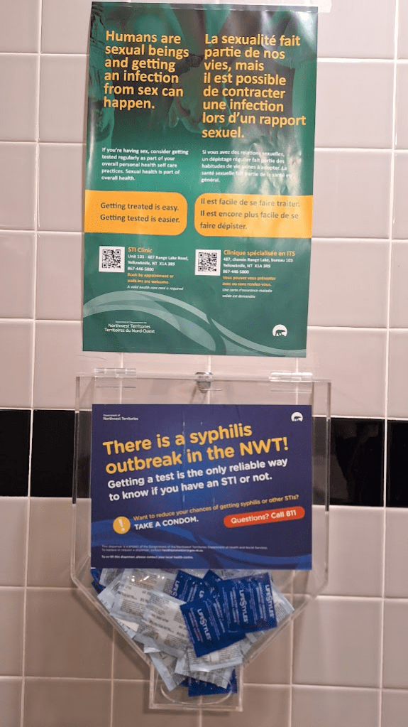 這裡的廁所有性病的標語,還非常友善附上保險套,有需要的人可以自取。