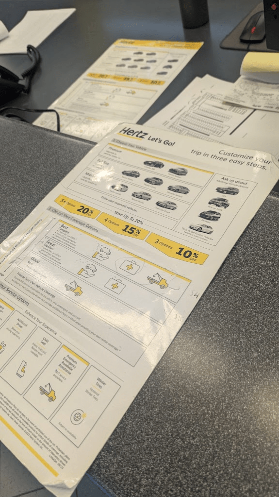 抵達Hertz櫃臺,拿出已準備好國際駕照、國內駕照、護照、影印的預約單(訂單編號)、Hertz App來完成取車。