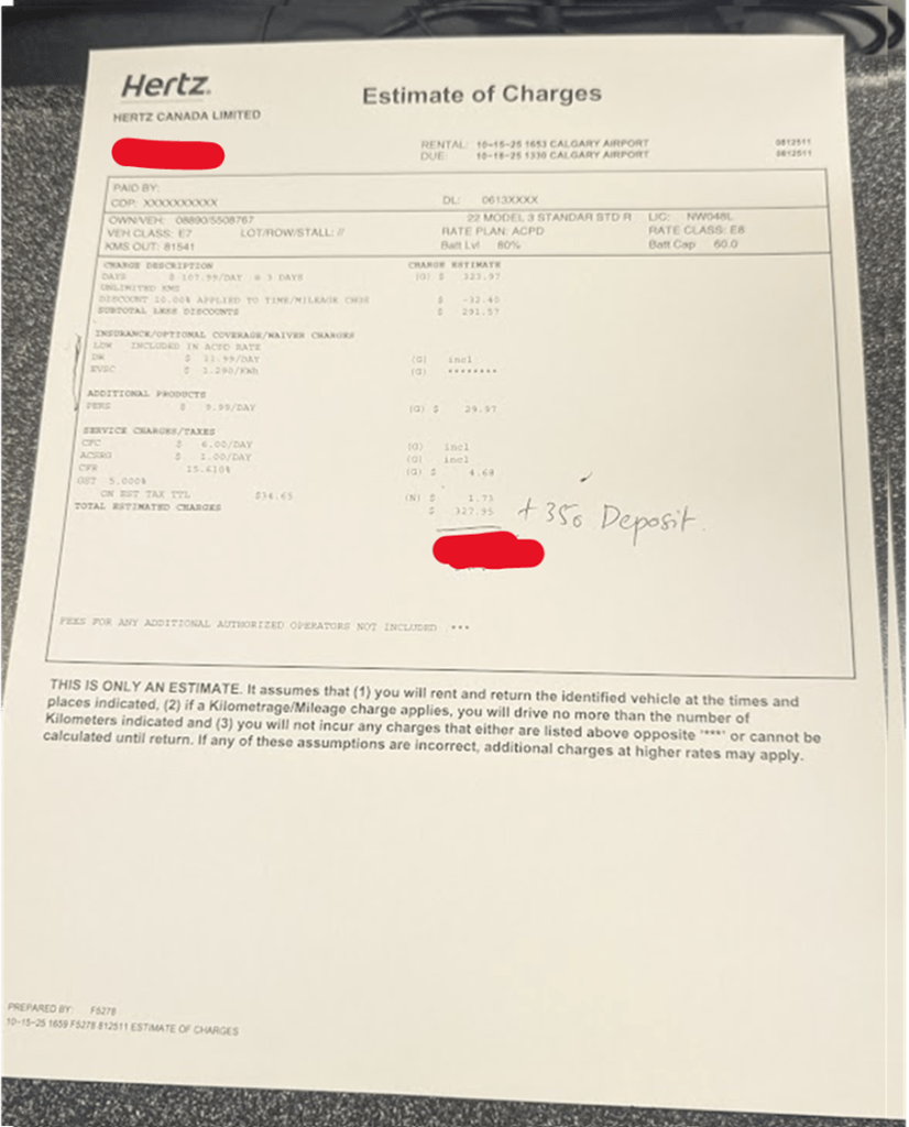最後櫃檯會詢問要不要加價返程後充飽電服務(租油車的話就會問要不要加滿油),這部分建議不要,除非你們的行程安排很緊湊,不然都是自行返回還車前充滿或加滿即可,自己加比較便宜。確認以上資訊無誤後依序請我們提供護照、國際駕照、台灣駕照。最後出示信用卡,除了租車費用外會多預扣一筆350加幣當作清潔或車輛毀損的訂金,待歸還車輛後,這筆會註銷。