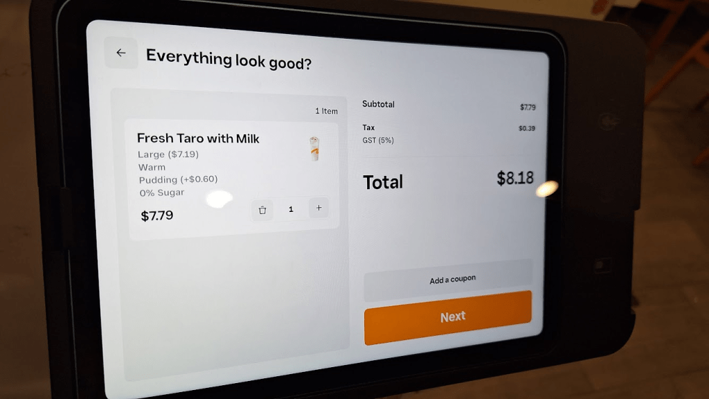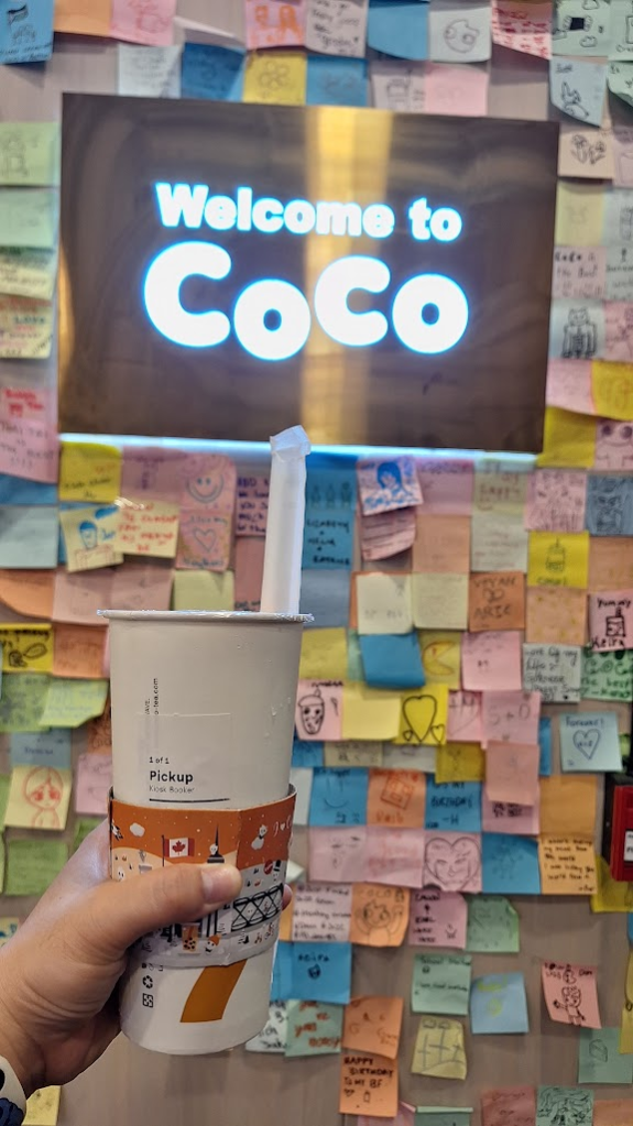 就在韓國料理旁邊,店內有內用區,牆壁貼滿來自世界各地的便利貼留言,有自助點餐機,點了Fresh taro with milk(芋頭牛奶)8.18加幣(約台幣185元)。