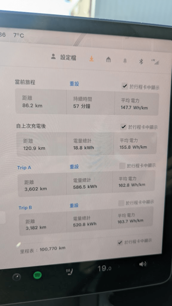 最終我們從第一天下午3點取車,第三天11點還車,最終三日租車費用共計402.2 加幣,刷卡金額為8,795新台幣(當時匯率約21.8),323.04的租車費+74.25充電費,其他可以忽略不計。因忘記在出發時設定特斯拉的里程,整趟旅程大約行駛650公里,海拔上升約800公尺。車上暖氣常駐22度,大概剩下30~50%之間會充電,共充了四次。當時在車上有看坎莫爾充電費率是0.5CA/千瓦。這樣應該充了約148.5度電,數據提供參考。