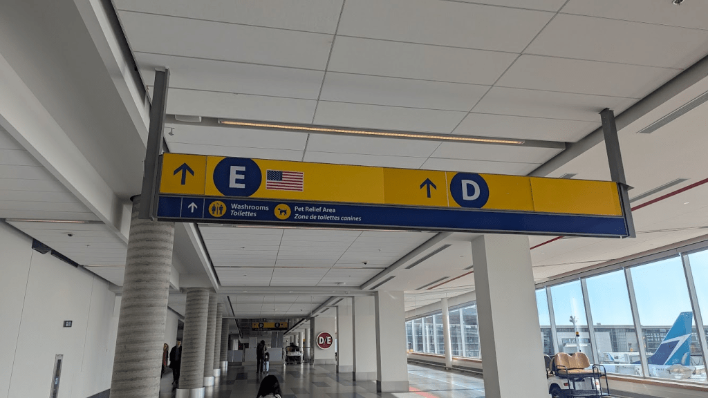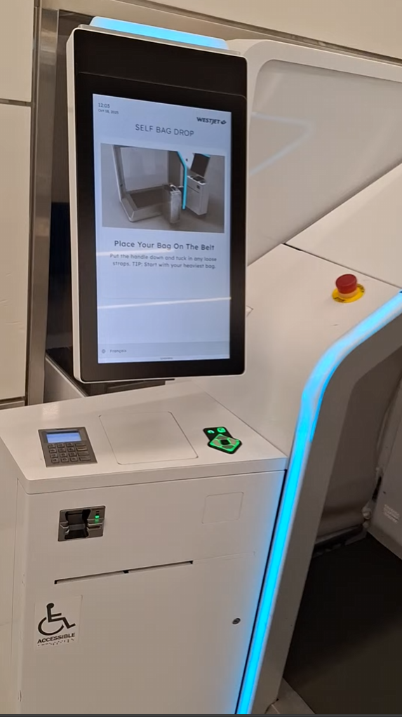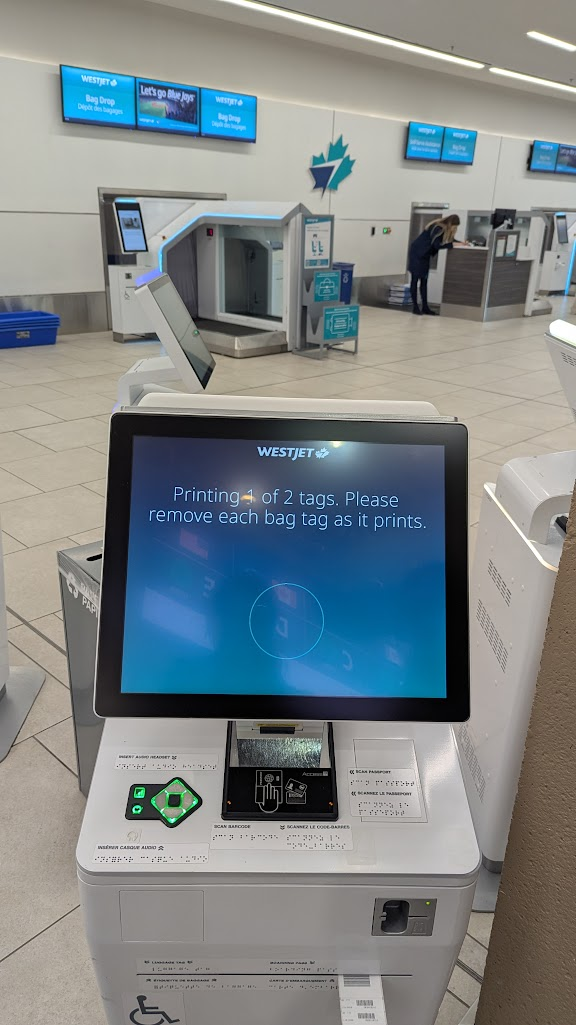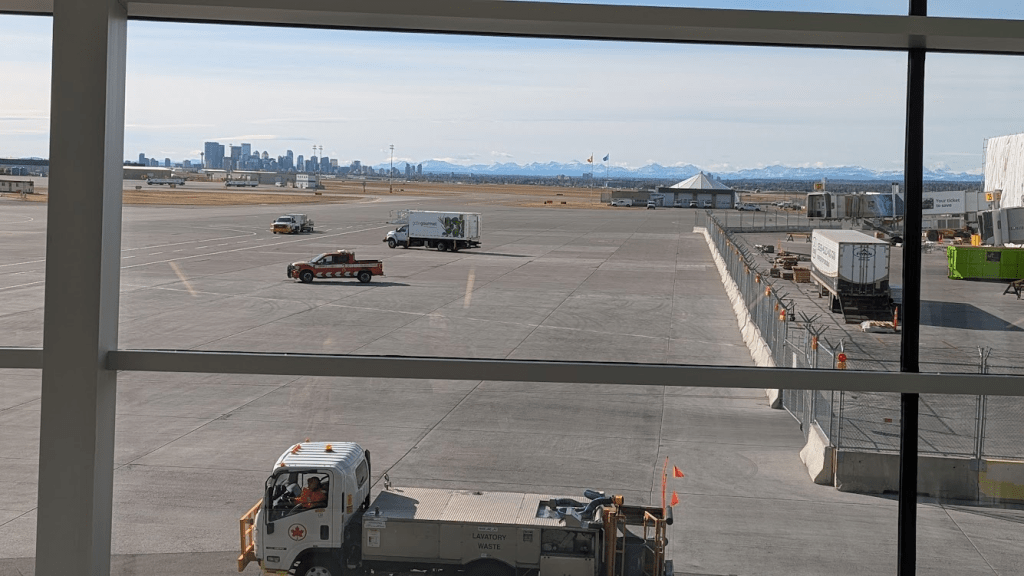 卡加利機場轉機指引很明確,就找到國內線對應的窗口,我們事前有線上報到,所以只要去自助機台操作寄行李就好,護照放上去掃描,印出行李條,套上行李箱,再放到輸送帶上掃描,沒問題按螢幕確認,就會直接把行李送進去。我們就兩手空空進安檢流程,到候機室商店晃晃或去窗台看飛機。