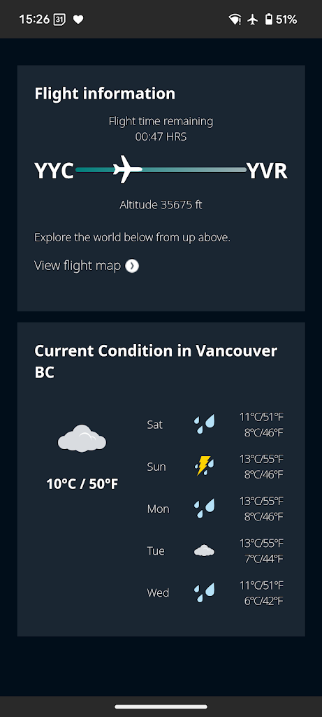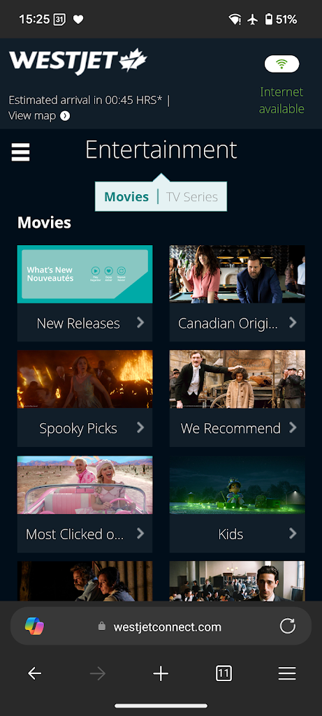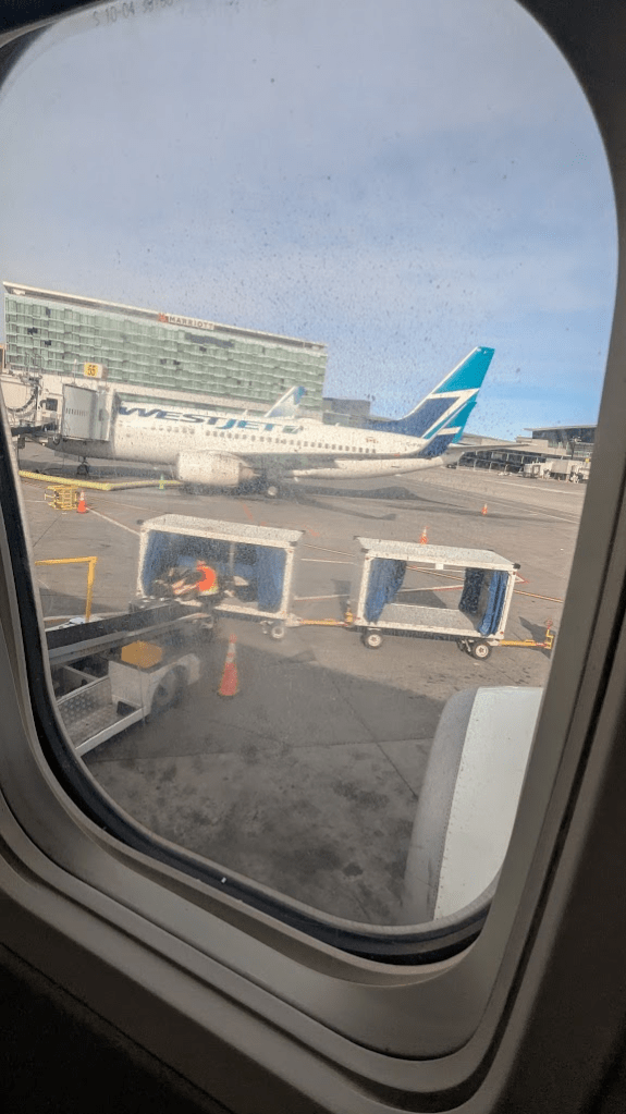 我們在加拿大的第三趟國內線飛機是WS119,卡加利下午3點起飛,於當地下午3點35分抵達溫哥華,搭乘時間約1小時35分鐘(1小時時差)。飛機上有提供簡易的Wifi娛樂使用,不像AirCanada提供完整的網路服務(AirCanada 溫哥華到黃刀鎮那段可以在機上發line照片、看youtube、滑FB)。