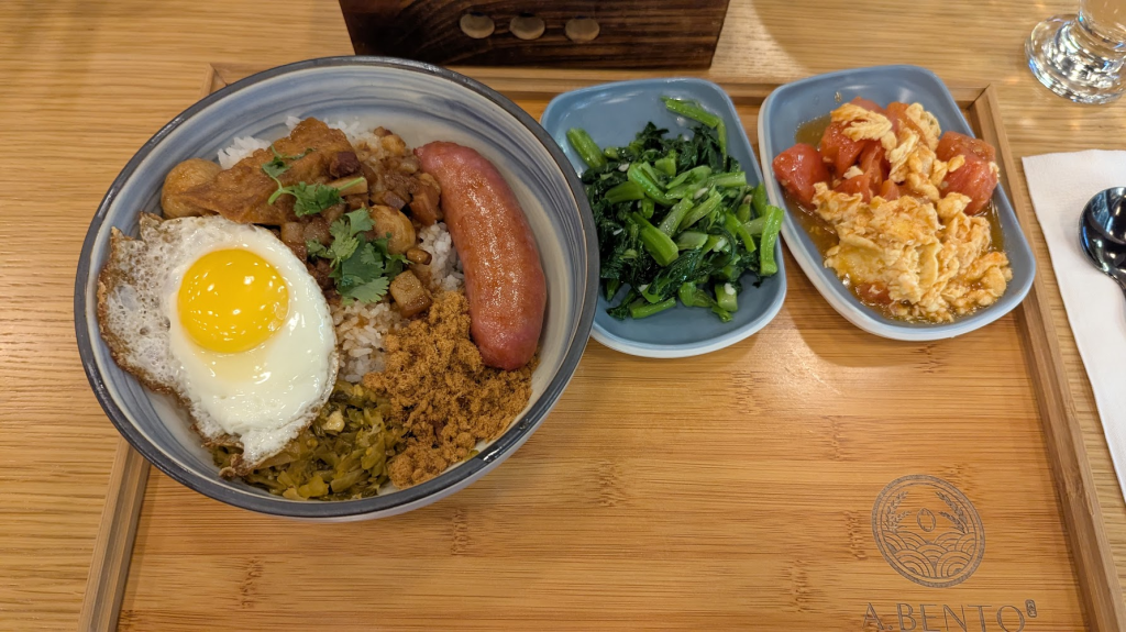 滷肉飯配上肉鬆(魚鬆?),滷汁又甜又肥妥妥就是站長喜歡的台南味(小編不愛),香腸也很台灣味,我在這真是受夠德腸了(委屈),另外還有油豆腐、鵪鶉蛋、炒油菜、番茄炒蛋配菜,標榜豪華兩字當之無愧,分量很可以。