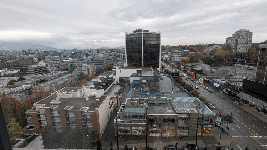 抵達溫哥華機場時下正在大雨,我們決定用金錢換取時間,直接坐uber到飯店check in。飯店乾淨整潔,因為房間位於較高樓層,風景還算不錯,飯店另有附早餐與健身房,可惜我們無緣享受這些服務。