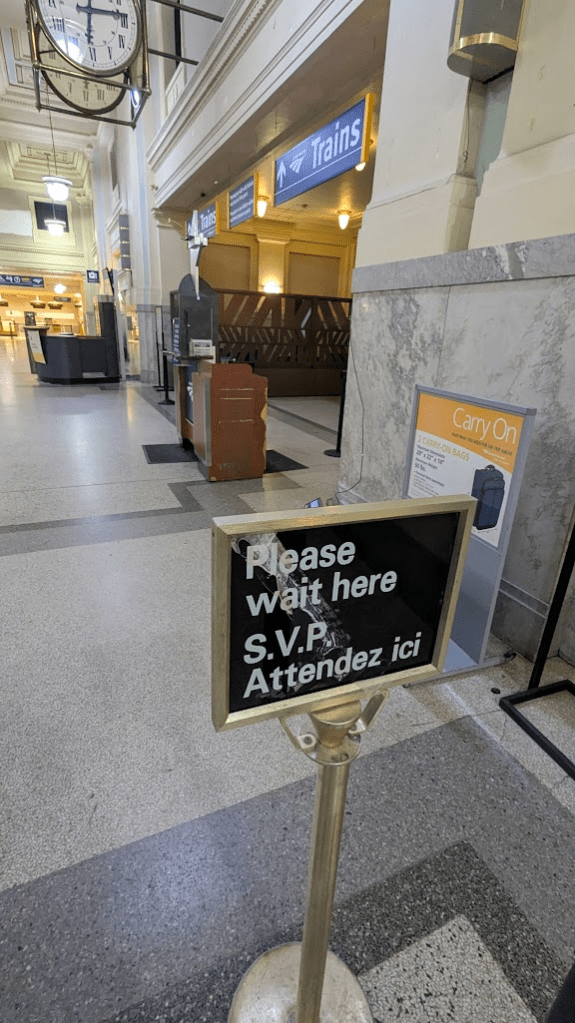 太平洋車站共有兩個驗票口,一個是火車站入口,一個是公車站入口。火車站入口正對著整個建築的正門。約莫等到5點40左右,站務人員才會把美國的入境調查單、小桌子、指示牌擺好。這時候就可以趕快拿來填寫並拖著行李排隊。裡面有小商店,但六點多都沒開。
