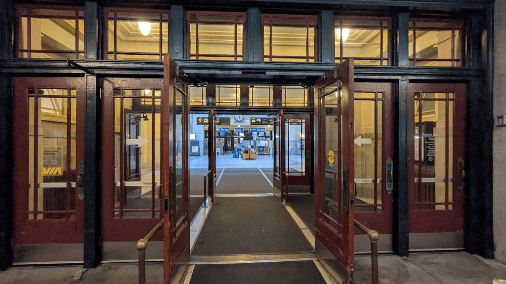 溫哥華太平洋車站於1919年竣工,是座百年車站,門口的自動門有著科技與古蹟結合,整個站體不大。