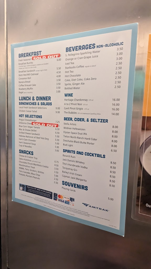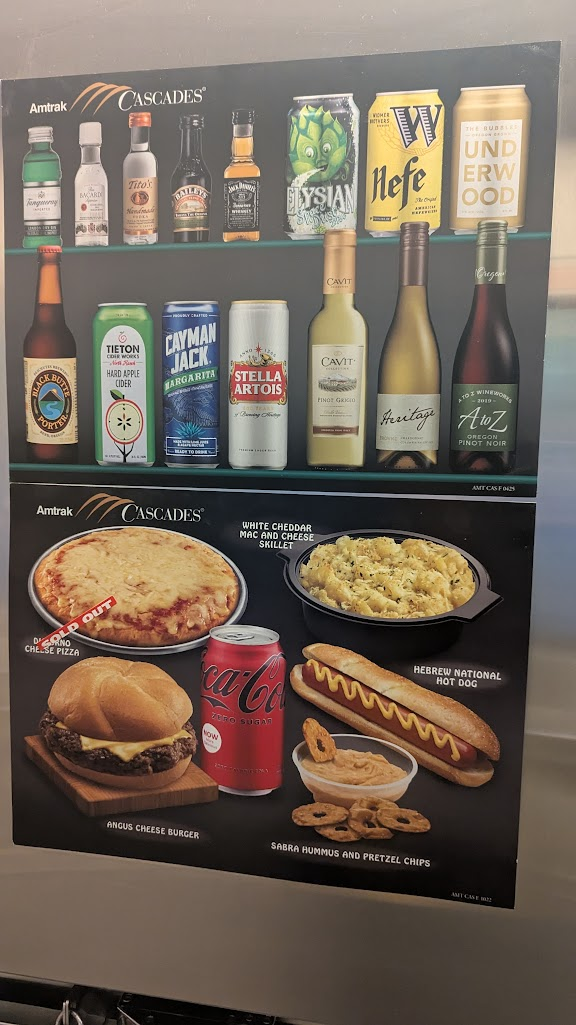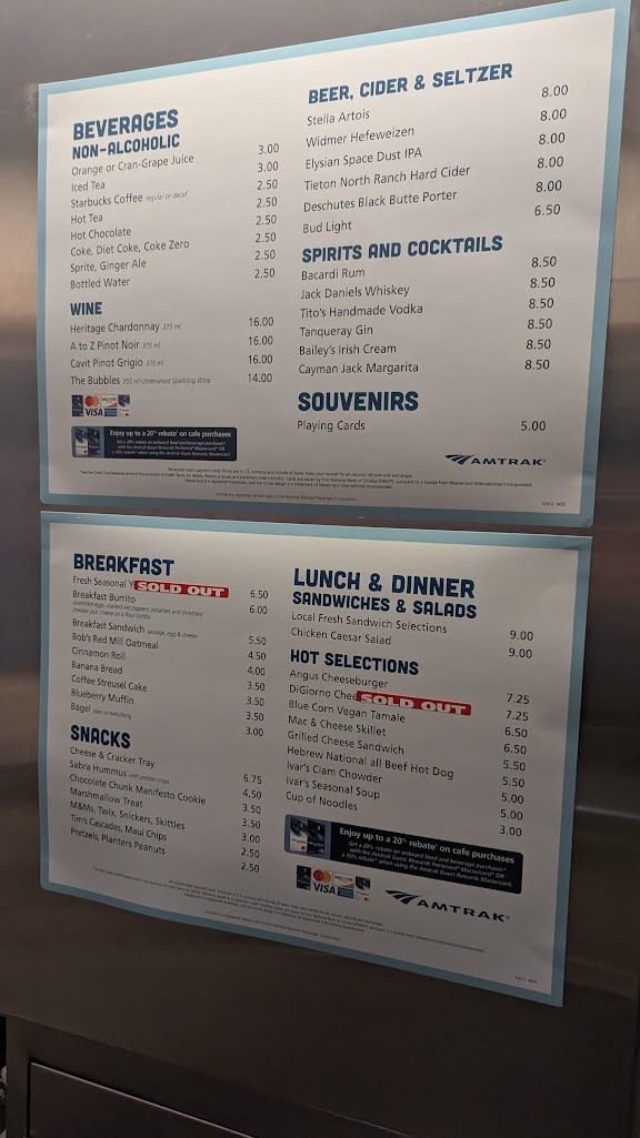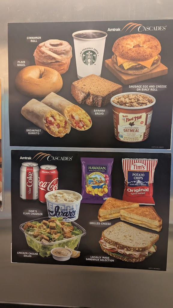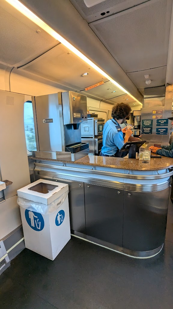過了邊境後會廣播已經開始販售食物,這時就可以直接走向餐車車廂選購早餐。餐車有販售星巴克、熱狗堡等各種飲料食物。
