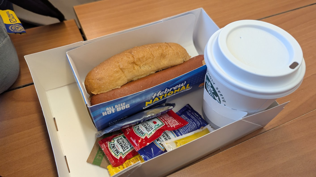 我們只點了小杯熱可可跟熱狗堡,這樣要8美元,小費自由打賞,徹底受到美國物價衝擊。熱可可類似是美錄粉泡的,熱狗是德式較鹹的,麵包則是跟台灣711的拿去微波差不多。餐車櫃檯一旁還有各種醬料跟紙巾,要自行拿取。