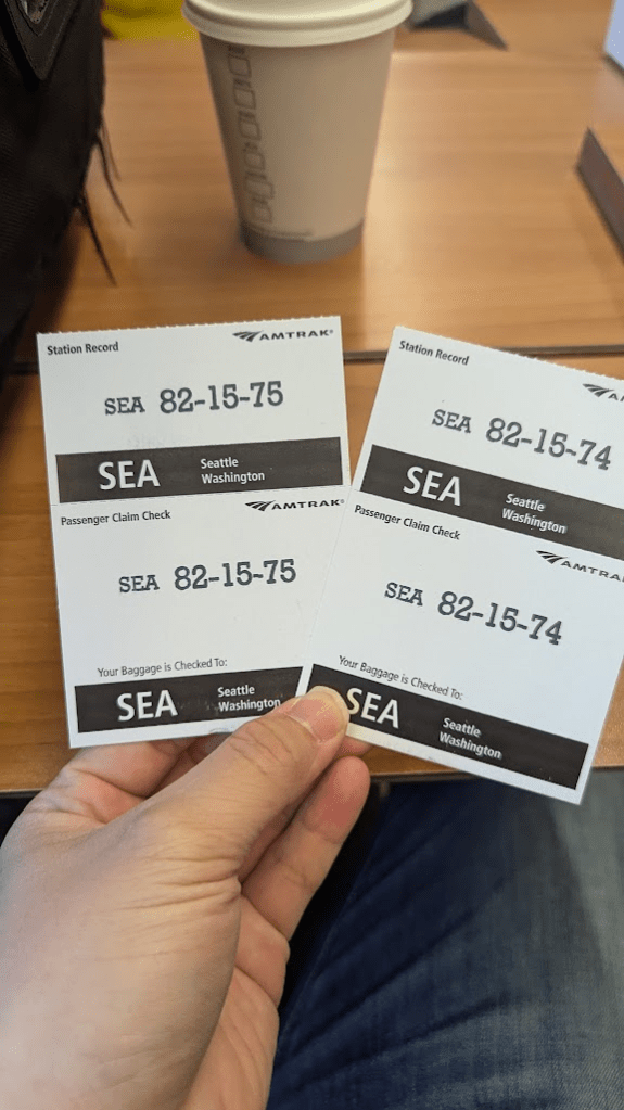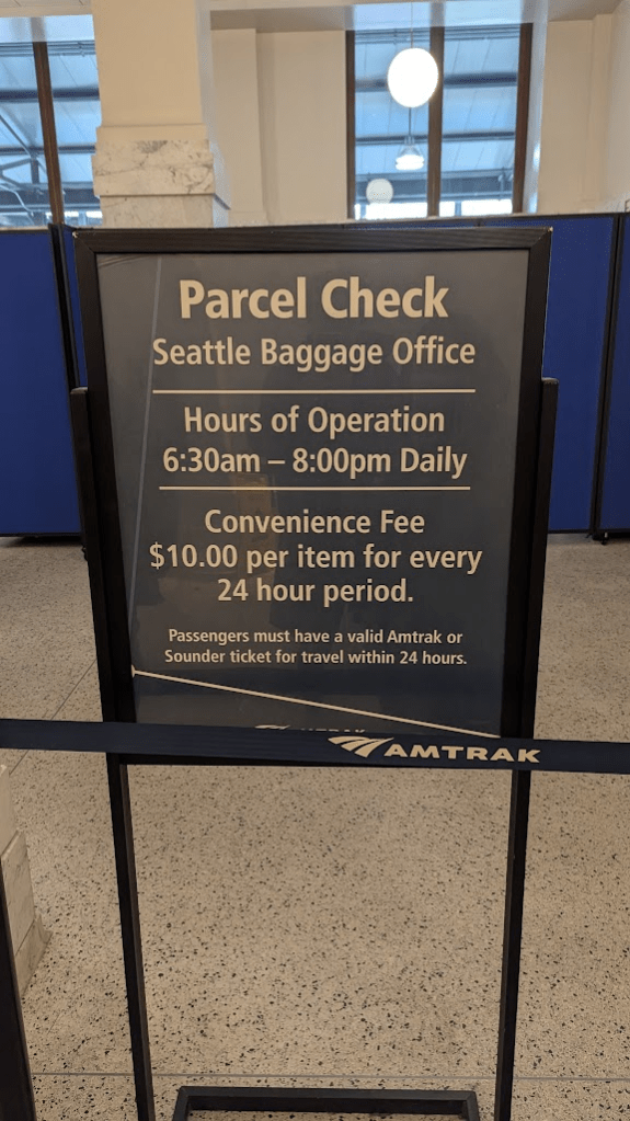 出示火車搭乘票根或QR Code可以在車站內寄放行李,一次一個行李箱10美元,如有其他可放在行李箱上的手提行李不另外計費。因我們的行程會直接去車站旁的唐人街吃午餐,順便走去MLB水手隊球場,所以選擇直接寄放在車站比較方便。一共寄了兩個28吋行李箱、一個登機箱、一件手提行李,切記不要把貴重物品放在寄放處,避免引發爭議。