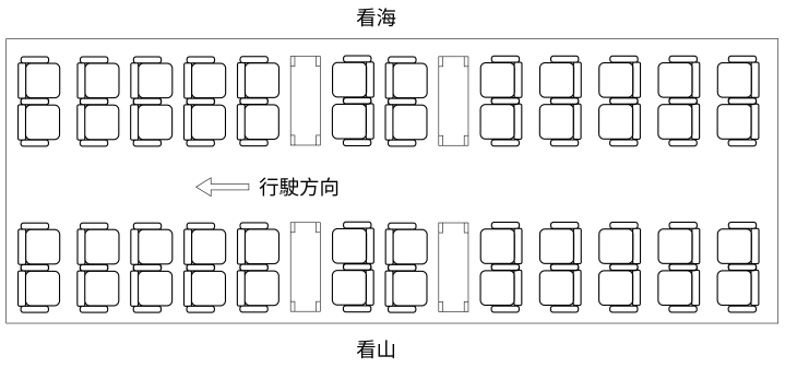寄完行李,繼續往前走,工作人員就會指示我們進入經濟艙車廂。經濟艙座位是朝向車廂中間對看的配置,其中中間會有四張帶桌子的家庭座,可以坐在一起聊天吃東西。選坐位時可考慮一下想看的景色,選靠右側看海景,靠左側看山景