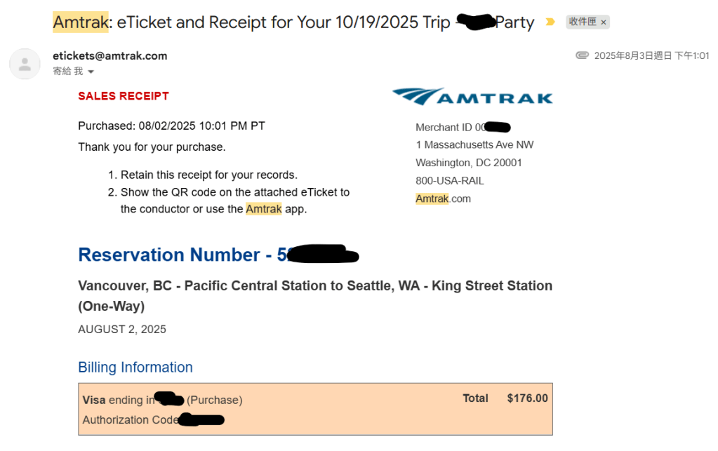 Amtrak 手機板(https://www.amtrak.com/app)也有如同台灣高鐵的車票功能,唯一不同是需要註冊會員(免費)登入後,可以透過訂位代碼將車票儲存於帳號中,報到時就直接出示QR Code並示意同行旅客即可,非常方便。不過建議也還是將Email內的複本影印一份,避免網路遇到問題。